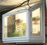 A garden window projects out from the wall of the house. It has